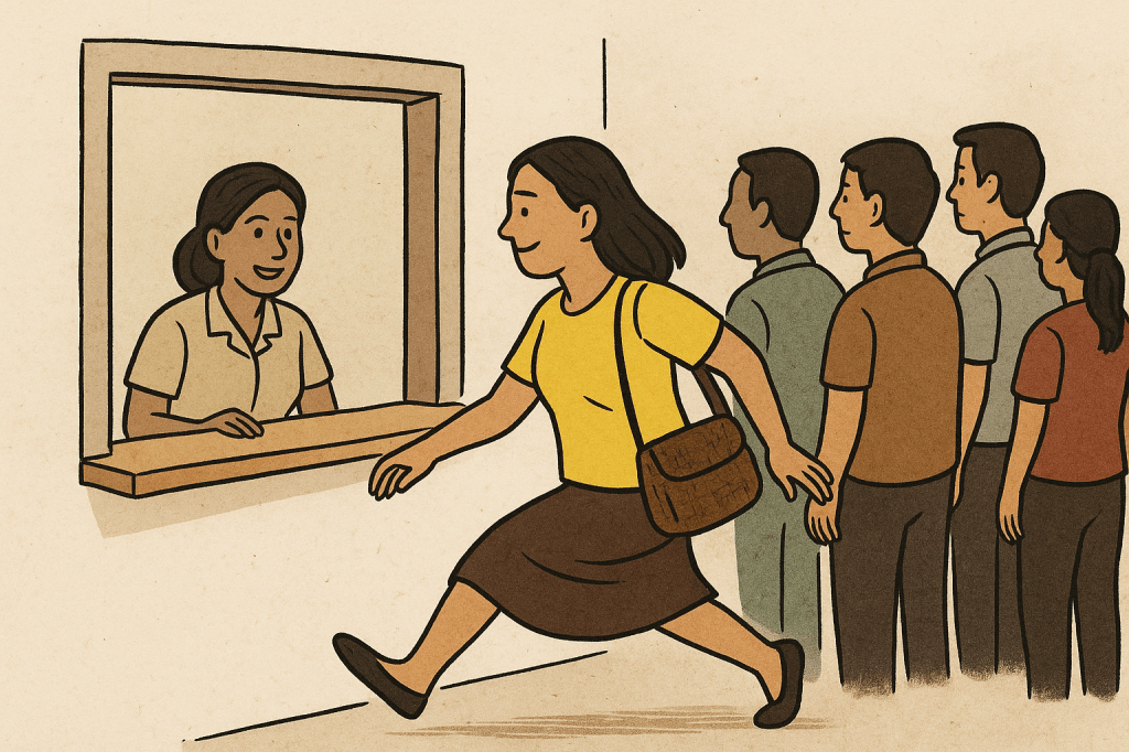 I was in line at the municipal hall recently, waiting to process a routine document. The line was long enough to test both patience and faith. Ahead of me, I noticed a woman quietly step forward toward the window, bypassing at least twenty of us. She nodded at the clerk, exchanged a quick smile, and her papers were processed in minutes.